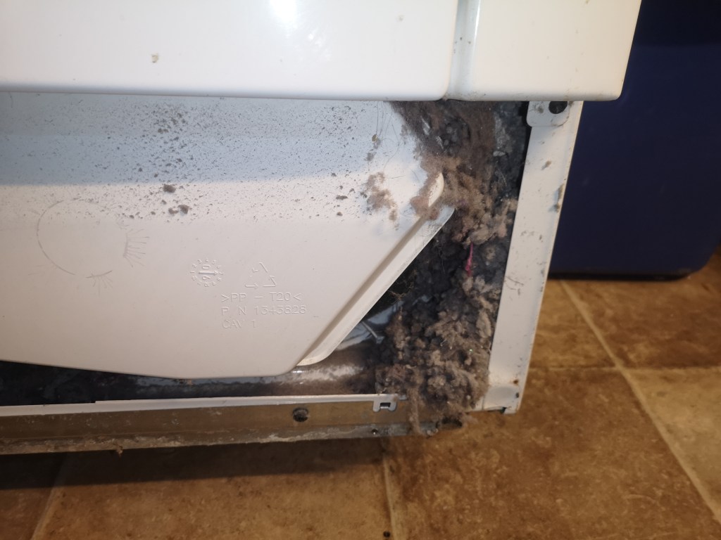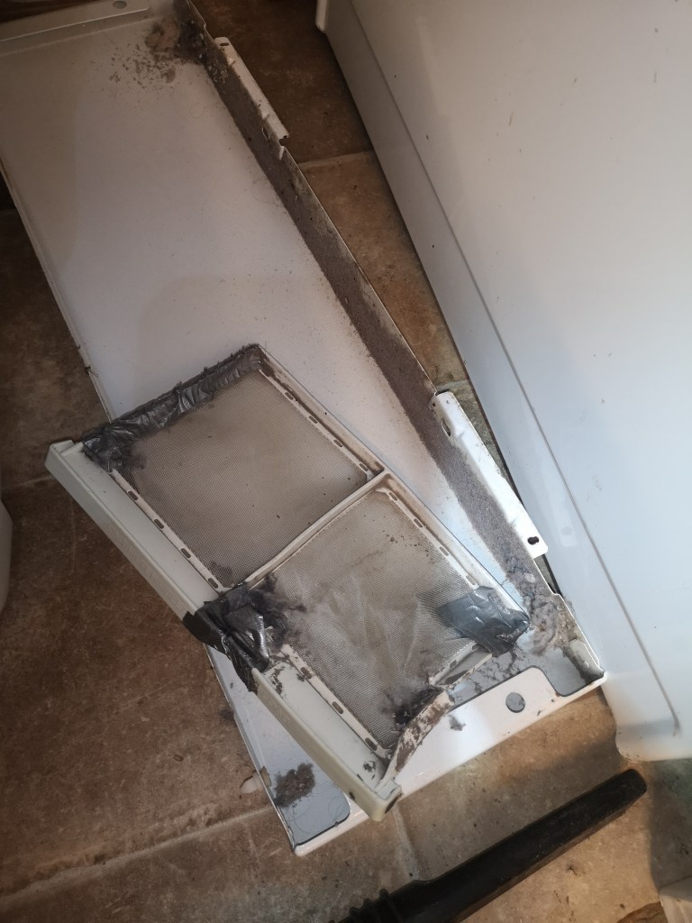 一个客户的烘干机不工作了,去拆开后简直没法看了。由于滤网破损没有及时更换,衣物绒毛堆积的到处都是,这烘干机再继续使用下去很有可能就着火了。